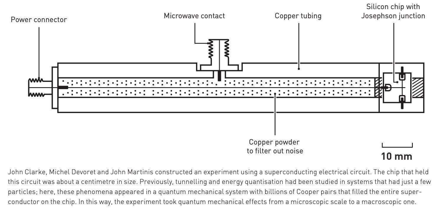 What these scientists (John Clarke, Michel H. Devoret and John M. Martinis) did that won them a Nobel was to develop a way to show these quantum-level events in a way we can see. They started with the concept of Cooper pairs (no, not named for Sheldon Cooper) which are pairs of electrons in a superconductor that match up their energy levels and act as a single wave function. They extended this concept to get a whole bunch of these Cooper pairs to act as a single particle.
